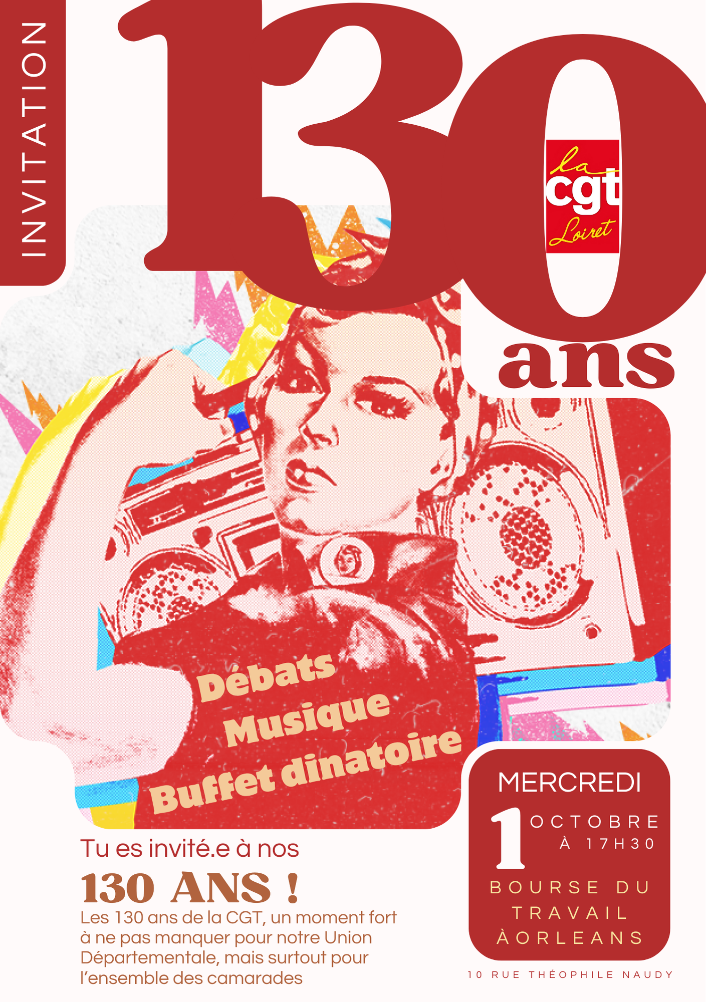 Nous avons le plaisir de vous annoncer que nous célébrons ensemble les 130 ans de la CGT à la Bourse du Travail - 10 rue Théophile Naudy 45000 Orléans -