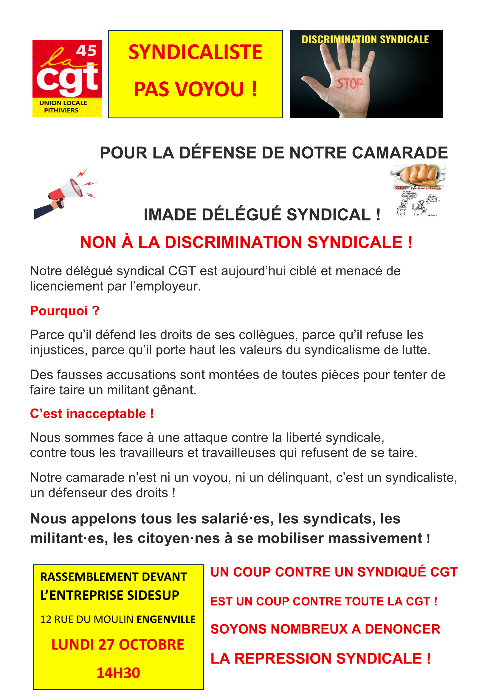 L’Union Locale CGT de Pithiviers dénonce une grave atteinte à la liberté syndicale au sein de l’entreprise SIDESUP, située à Engenville.
