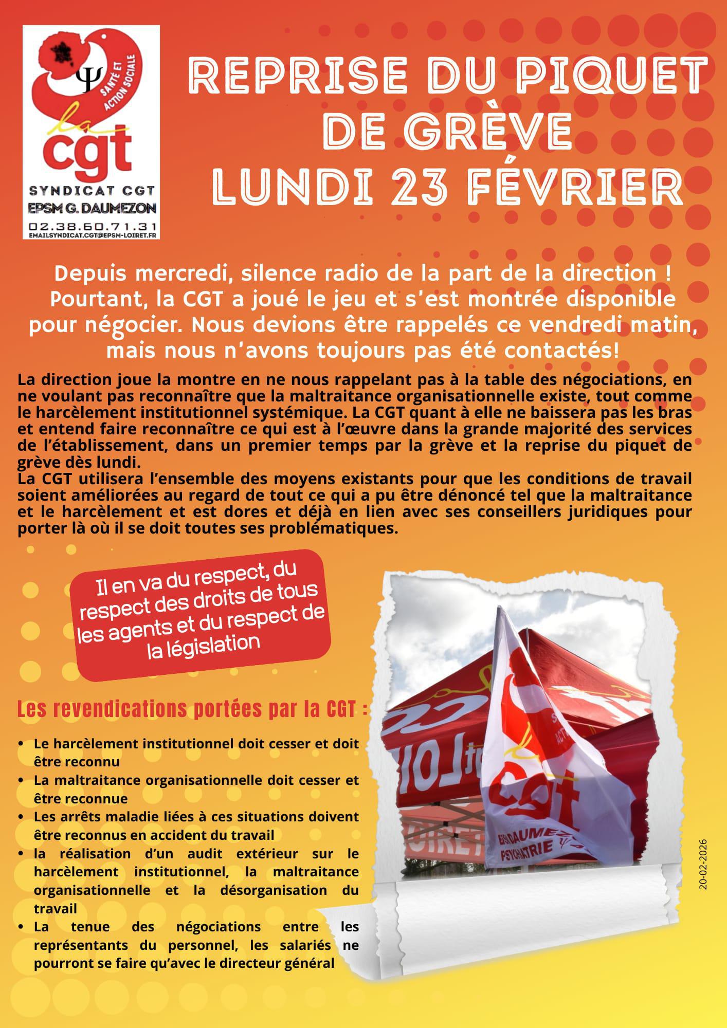 Face à cette attitude inacceptable, le syndicat CGT de l’EPSM Daumezon a décidé de reprendre la mobilisation à partir du lundi 23 février dès 6h30.