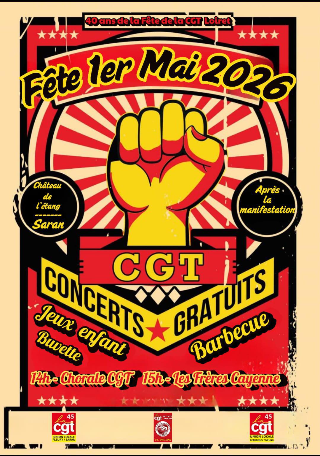 Cette année est spéciale : nous fêtons les 40 ans de la Fête de la CGT Loiret ! 🎂 Après la manifestation, rejoignez-nous pour un moment de solidarité, de détente et de musique dans le cadre verdoyant du Château de l’Étang à Saran.